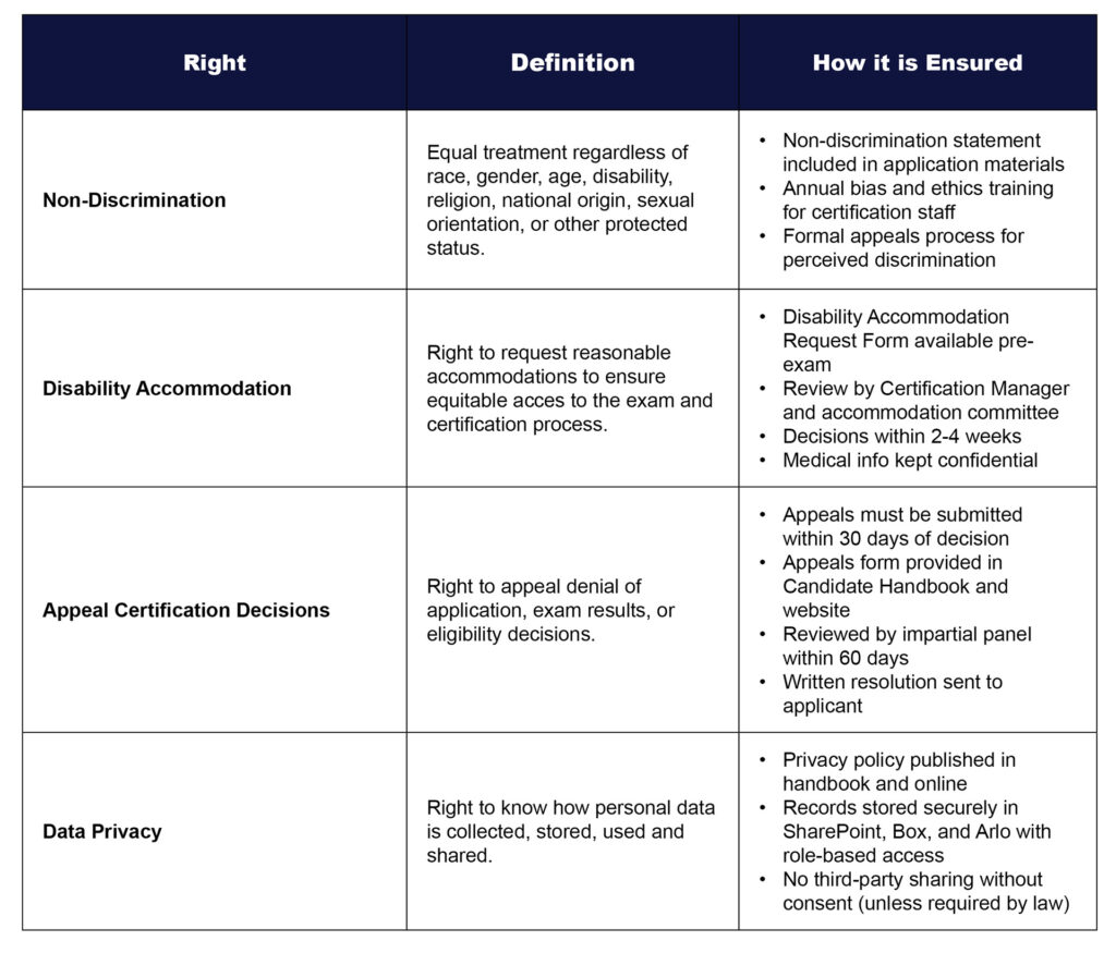 - Maintaining Certification Status – Certified individuals must meet all renewal requirements, comply with recertification procedures, and pay applicable fees to maintain active certification status.