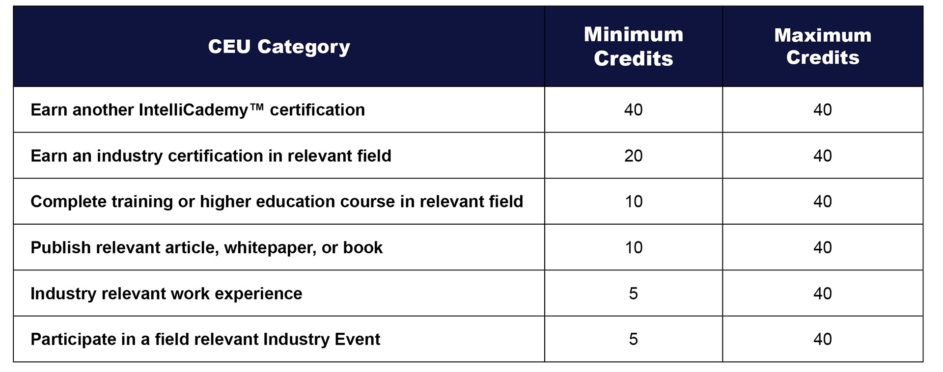 CEUs are measured by the minimum amount of time a candidate needs to devote to achieving the credit and any relevant experiences not listed in the table above may be submitted to IntelliCademy™ with justifications as to how those experiences were relevant to the field associated with the certification they wish to renew.