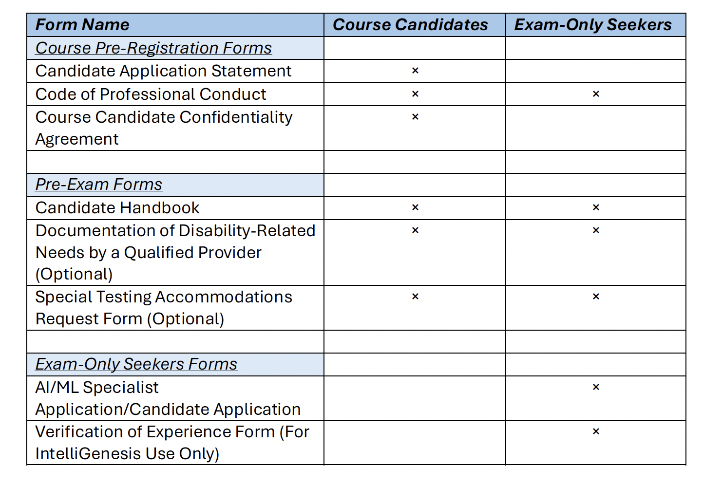 If you are seeking to take the exam only and do not plan to take the AI/ML Specialist Beta Course before the exam, please email registrar@intellicademy.ai to request the eligibility application before registering and paying for the exam on the IntelliCademy™ website.
